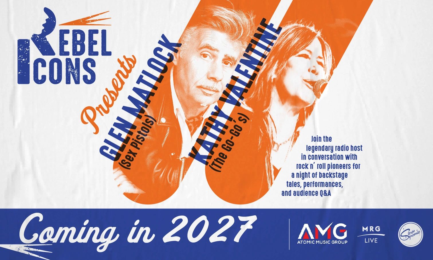 This new live speaker series brings together music legends Glen Matlock (Sex Pistols) and Kathy Valentine (The Go-Go’s) for an intimate evening of stories, conversation, and music. Join us for a rare chance to hear the icons who shaped rock music in their own words.